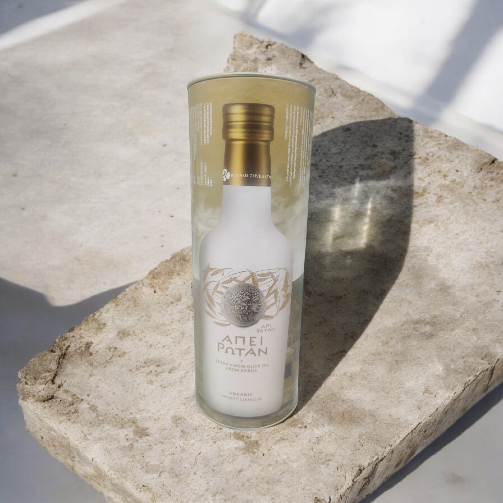 Abgefüllt ist das Olivenöl in eine hochwertige weiße Tonflasche, die optimal vor Licht schützt und die Qualität langfristig bewahrt. Zusätzlich ist die Flasche in einem eleganten Karton verpackt und eignet sich perfekt als hochwertiges Geschenk der besonderen Art.
