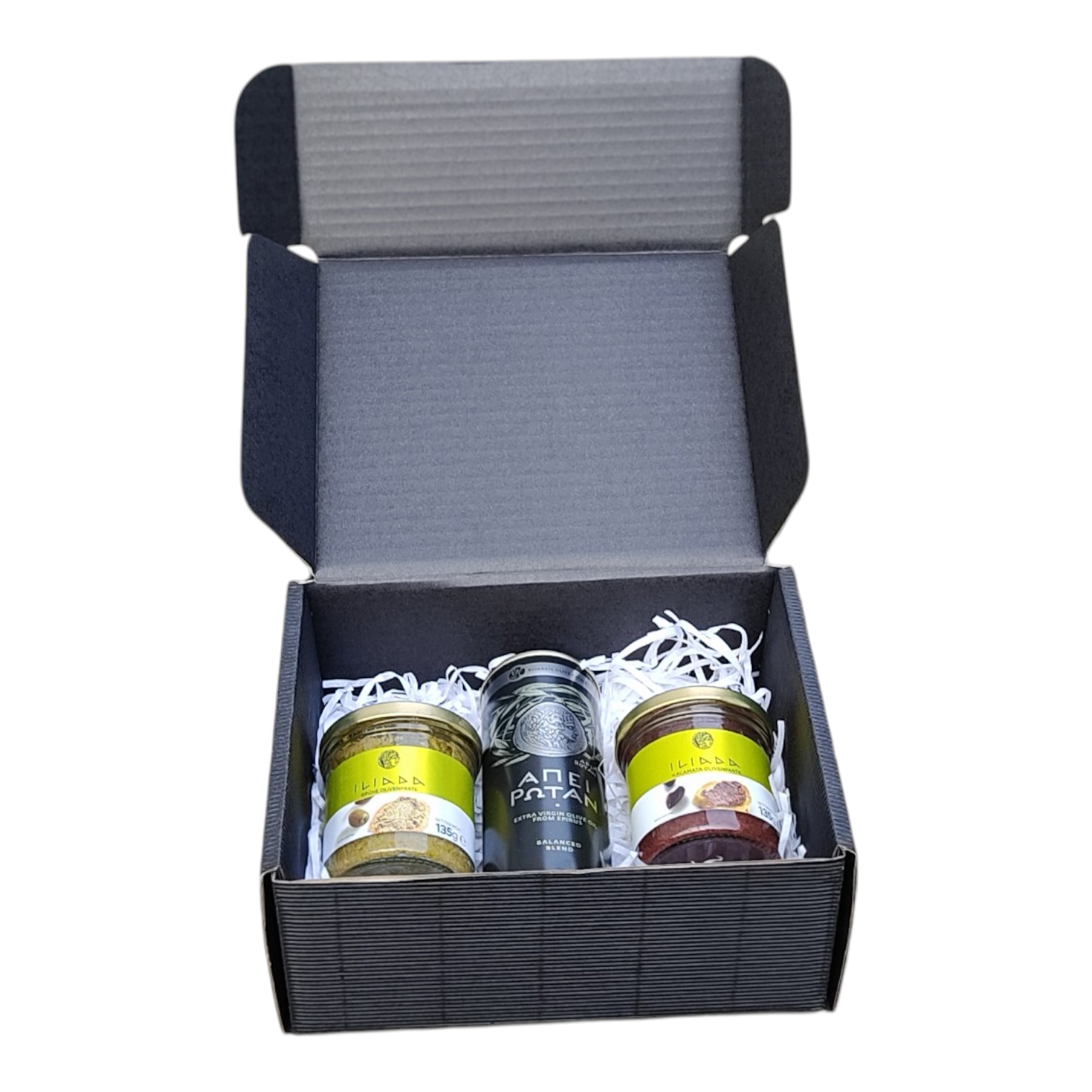 Im Mittelpunkt steht ein hochwertiges Olivenöl direkt vom Erzeuger. Ergänzt wird es durch zwei feine Olivenpasten mit jeweils 135 g: eine aromatische Kalamata Olivenpaste und eine delikate grüne Olivenpaste. Diese geschmackvolle Kombination macht das Set zu einer besonderen Geschenkidee für Genießer, Feinschmecker und Menschen mit Sinn für Qualität.